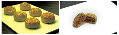 ④将水油皮、油酥分别揪成小剂子,一份水油皮包入一份油酥,收口捏严朝上,按扁,擀成牛舌形,两头对折,擀成长方形再对折,擀成皮坯,包入馅心收口捏严,刷鸡蛋液沾上麻仁即为生坯。