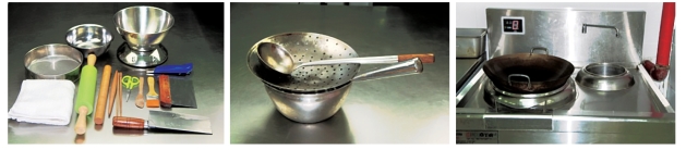 图8.4 盆、刀、刮板、开酥刀、擀面杖、电炸锅、漏勺、电子秤、面筛、保鲜膜、毛巾、毛刷等