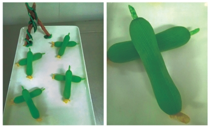 ③将水油皮包油酥,开酥2/2/3折后用开酥刀分割成6块面片,用蛋液将面片重叠粘在一起,用刀切剂、擀皮、包馅,包捏成黄瓜生坯,插上黄瓜花和黄瓜梗即为生坯。