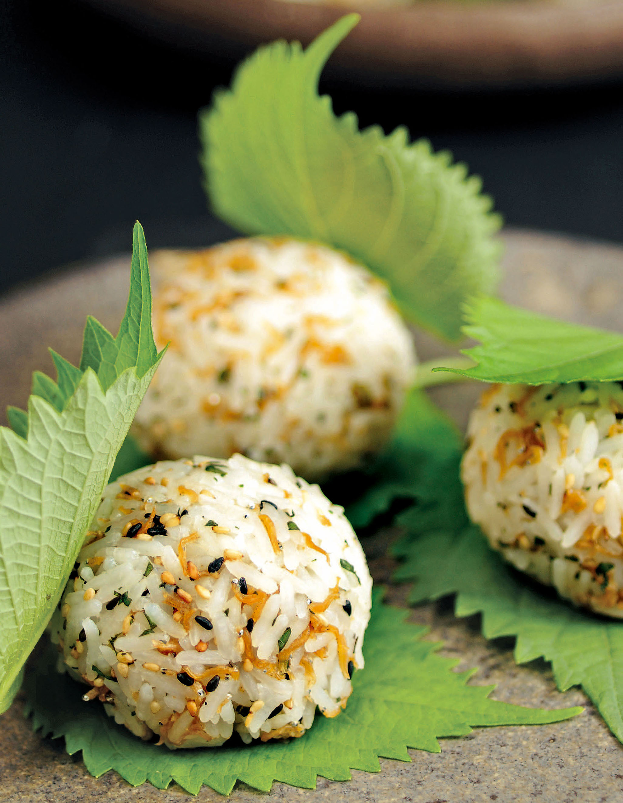 8.提起保鲜膜四角包裹米饭,转紧捏成饭团状,拆去保鲜膜,轻放于紫苏叶上,便成又好看又好吃的手工饭团!(三分钟)