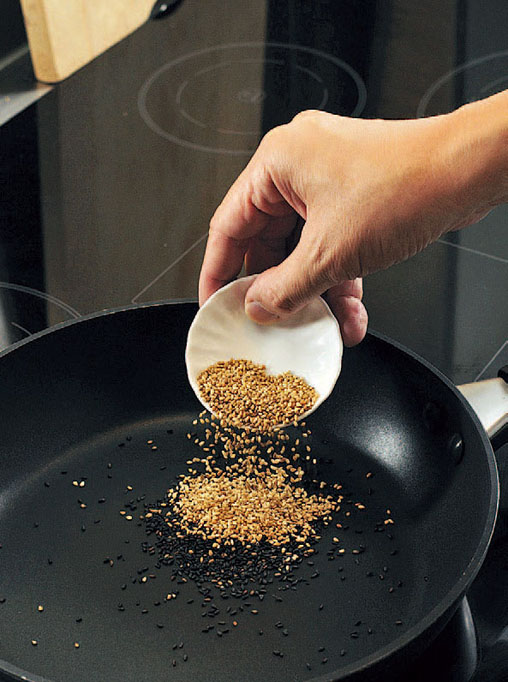 1.先将黑芝麻与白芝麻用中火烘香。(一分半钟)