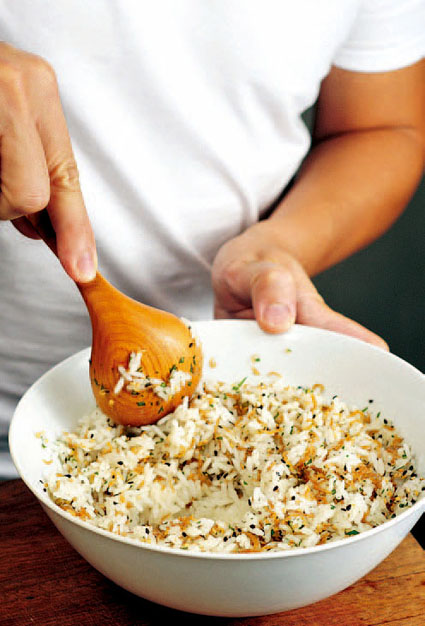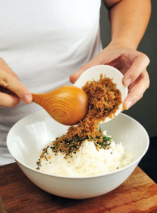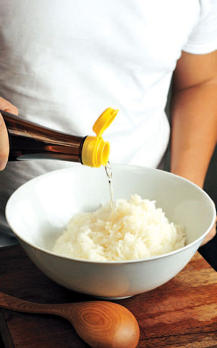 4.白饭盛大碗中,加入少许味淋。(半分钟)