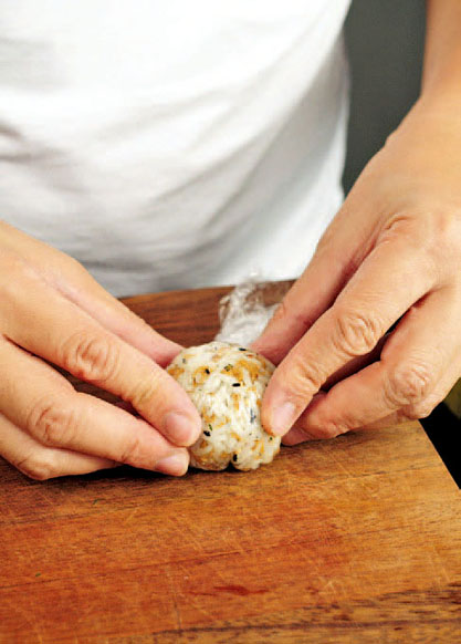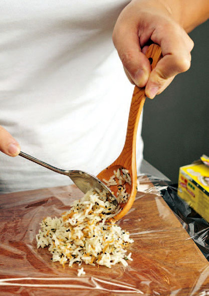 7.将两大匙拌好的米饭放于保鲜胶膜中。(半分钟)