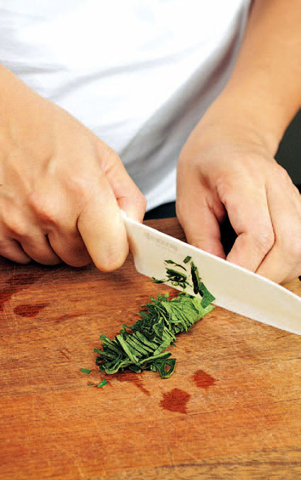 2.将四块新鲜紫苏叶切细成蓉。(两分钟)