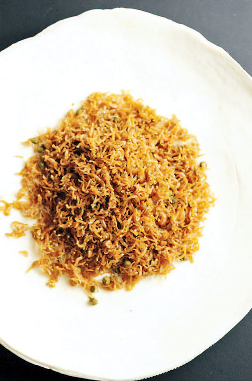 5.将烘好的芝麻、山椒小鱼干一并放入。(半分钟)