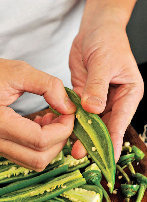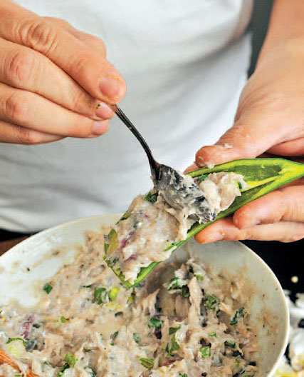 6.以小勺将鱼肉酿入尖椒,压平。(两分钟)