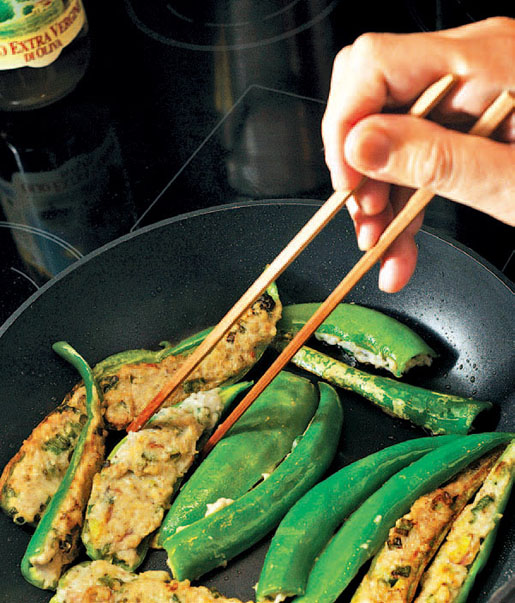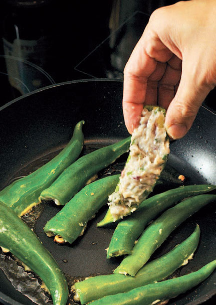 8.以中火将酿好的青尖椒煎香。(三分钟)