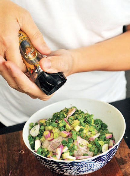 认识好久的一位中菜总厨,最喜欢吃的原来是由母亲亲手做的煎酿三宝——用刀刮剁手打的鱼肉加上果皮、葱粒和胡椒粉,拌匀后酿入灯笼青椒或红椒、茄子和炸豆腐里,慢火煎香再浇入豉油提味,热腾腾三宝和冷冰冰啤酒简直是绝配。