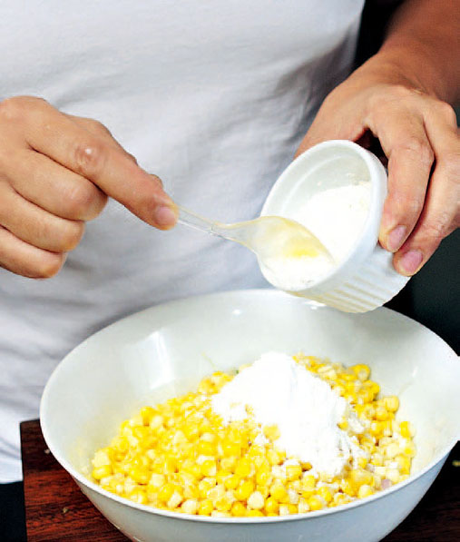 5.将蛋液注入盛好粟米粒的碗中,同时把面粉放进。(一分钟)