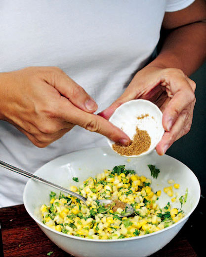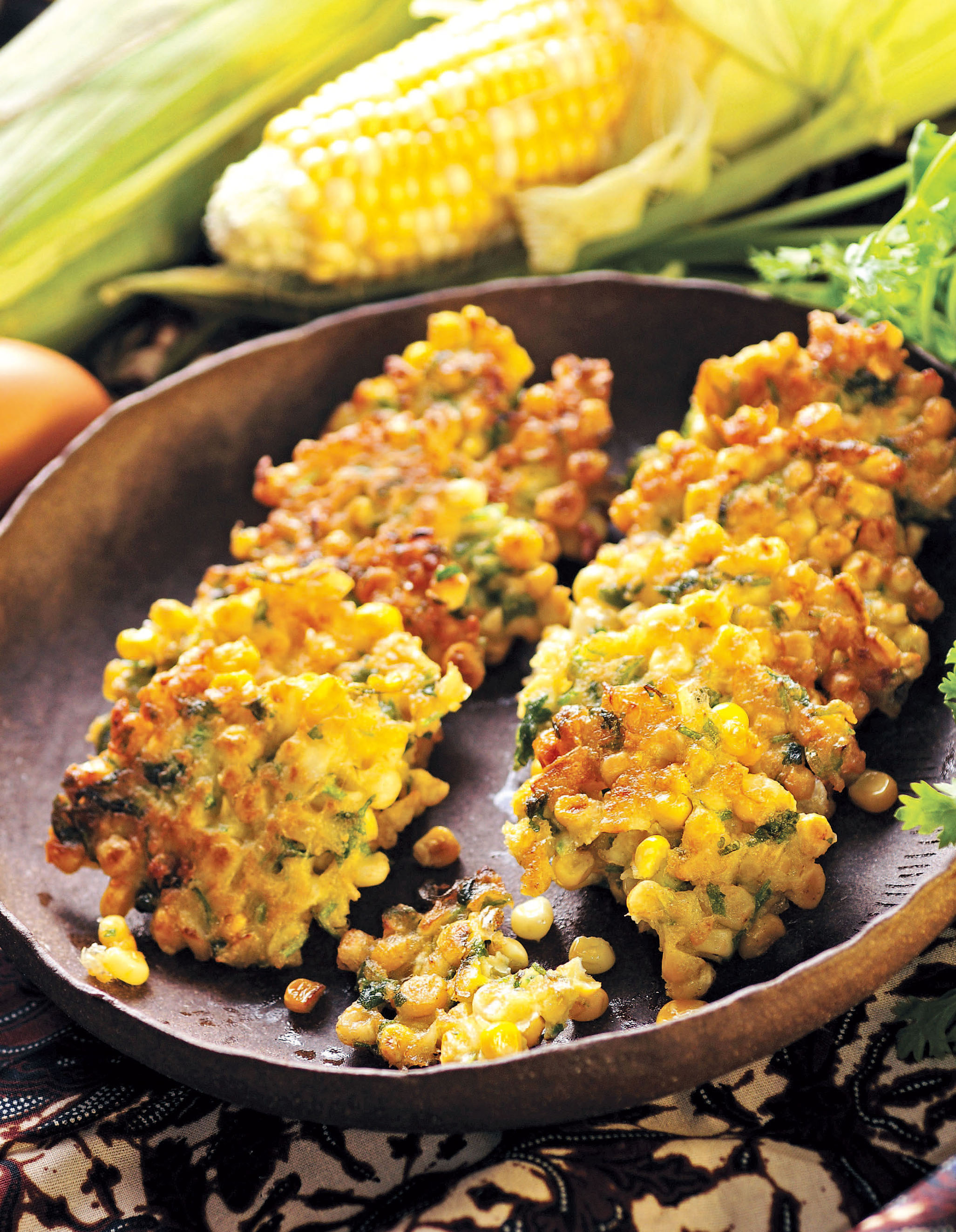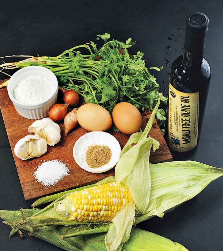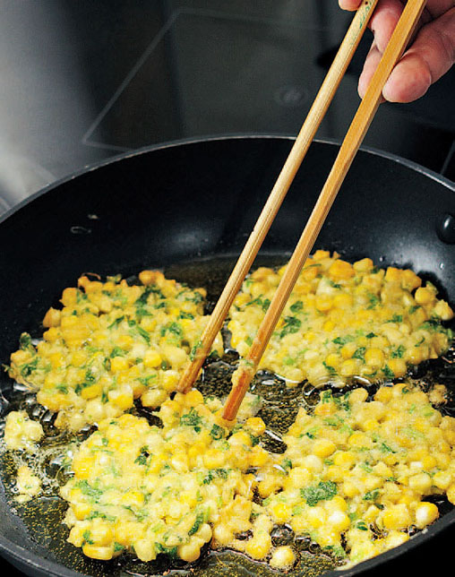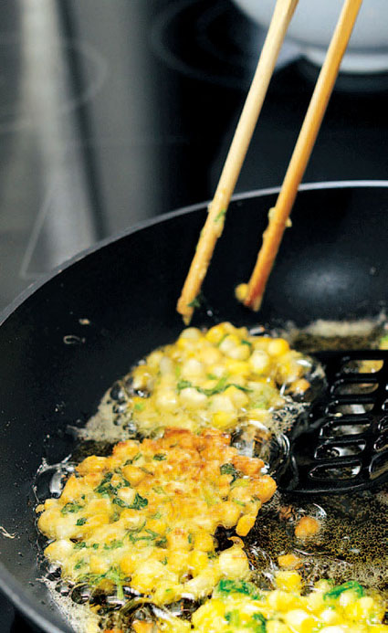 9.橄榄油下锅,以木匙将粟米逐份放入,以中火煎成小饼状。(两分钟)