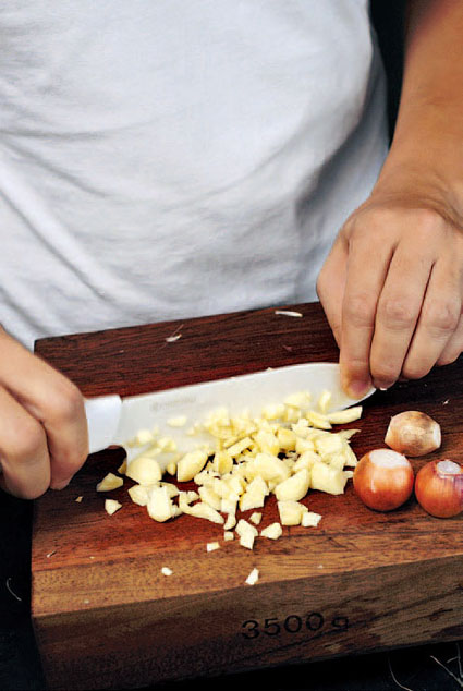 2.蒜头及红葱头去衣切细备用。(三分钟)