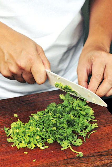 6.加入蒜头粒、红葱头粒及芫荽,一并拌匀。(一分半钟)