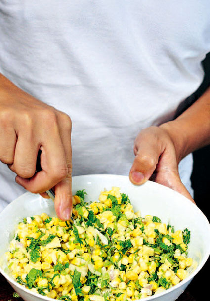 回到厨房里,迫不及待把粟米层层剥开,先掀起叶片再拨开须芯,真“人”露相,金光耀眼,果然是饱满结实的好家伙。忍不住拔出几粒放进口里,哗哗哗,这才是超甜的选择!马上唤来正在准备摄影器材的小助手,把几颗粟米粒腾空投射到他口里——先得尝过这清甜绝顶的来自土地自然的不加人工包装的美味,然后替它们拍照造像才会更有感情,更真实更美!