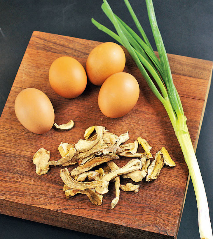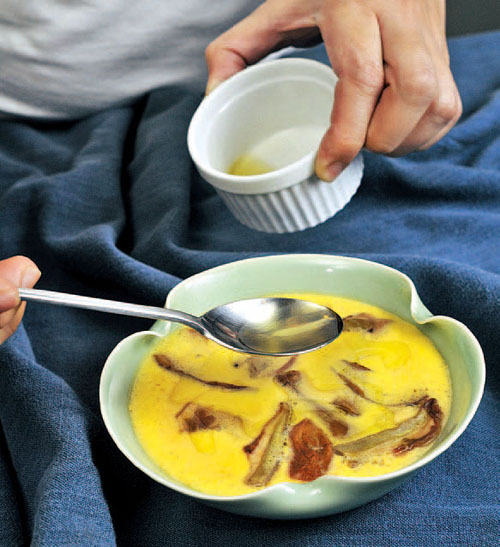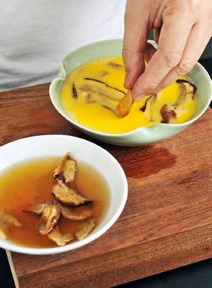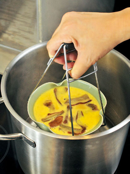 6.放入适量浸软之牛肝菌,原碟放入已烧开水的锅中,以另碟加盖,以防倒汗水影响蛋面。(一分钟)