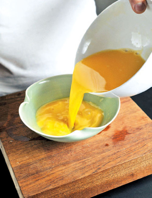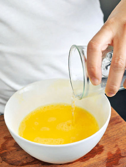 4.加进蛋液容量一点五倍白开水,再一起拌匀。(一分钟)