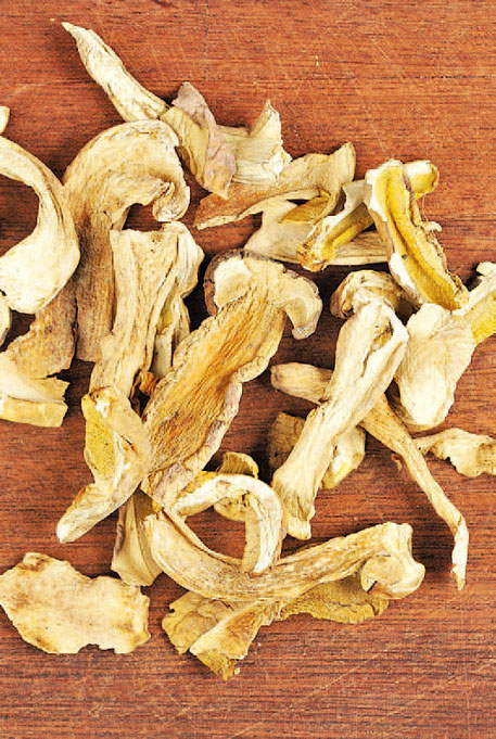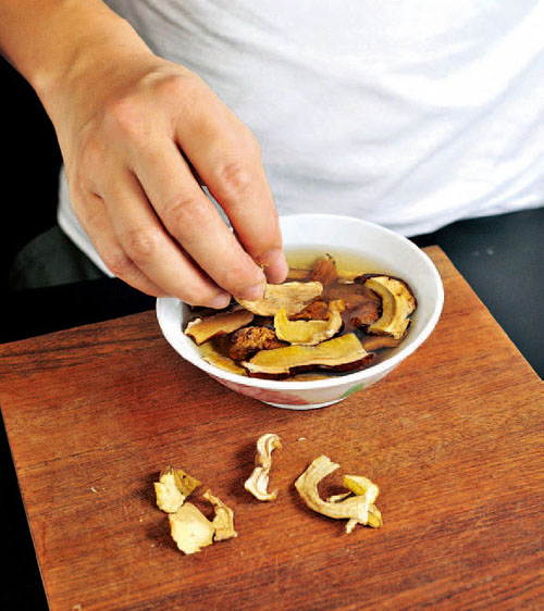 1.先将牛肝菌干用冷水冲洗去沙,再用温水浸泡至软身。(四分钟)