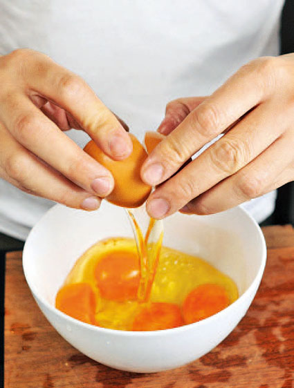 3.打开四只鸡蛋,打匀成蛋液。(两分钟)