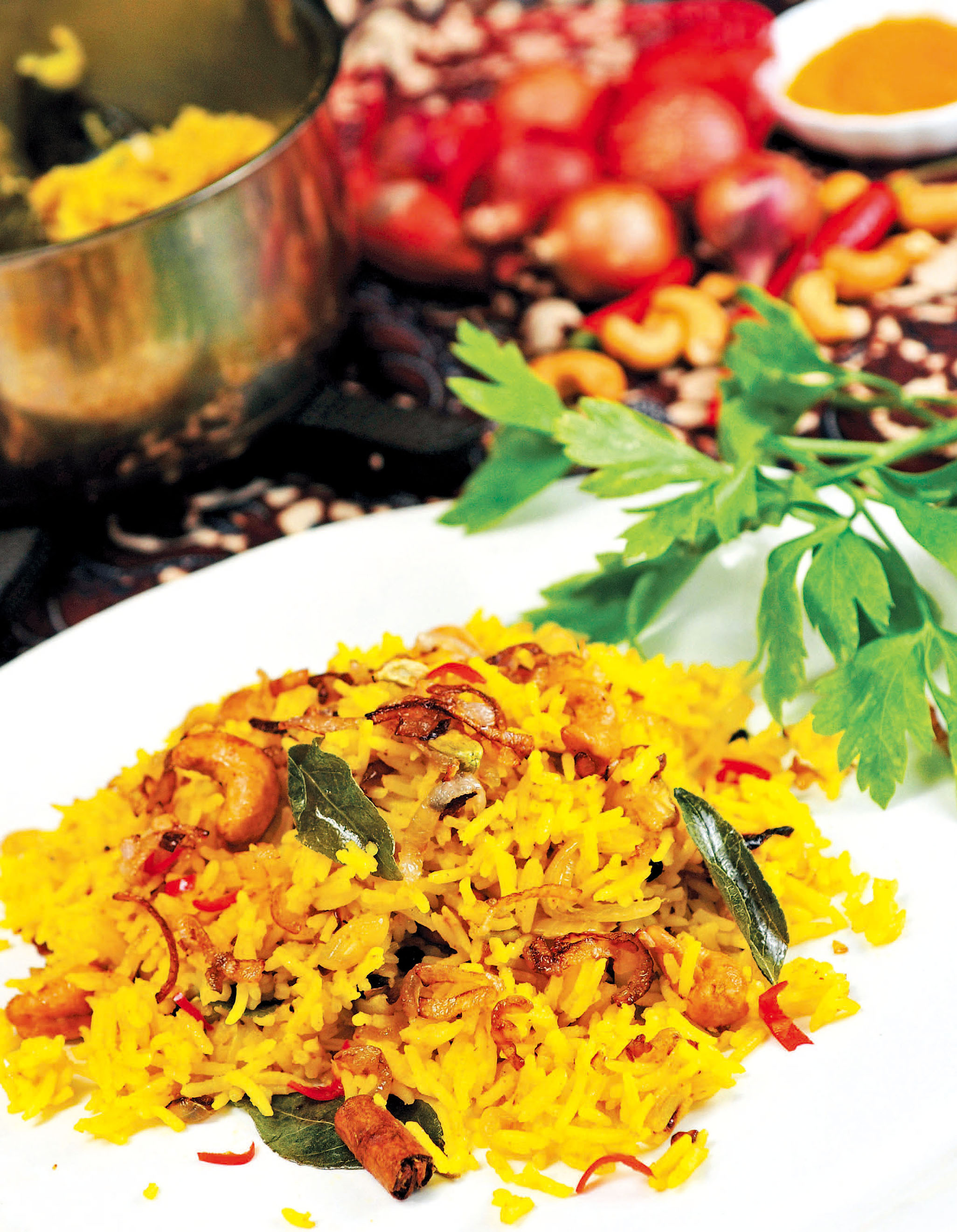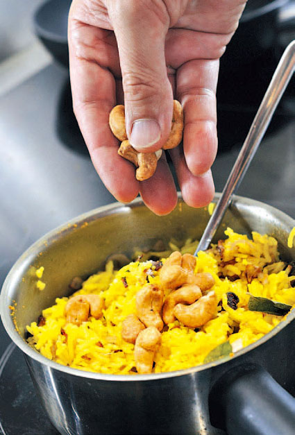 8.撒上已烘制过的腰果,红辣椒洗净去籽切丝,也一并加入拌匀。香气四溢之香料饭,公平共享。(一分钟)