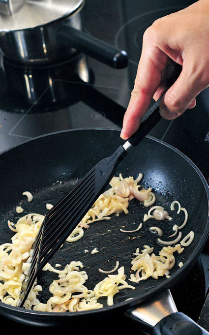 3.以橄榄油起锅,以中火将红葱头丝炒至金黄,先夹起取出三分之一留待上碟用。(四分钟)