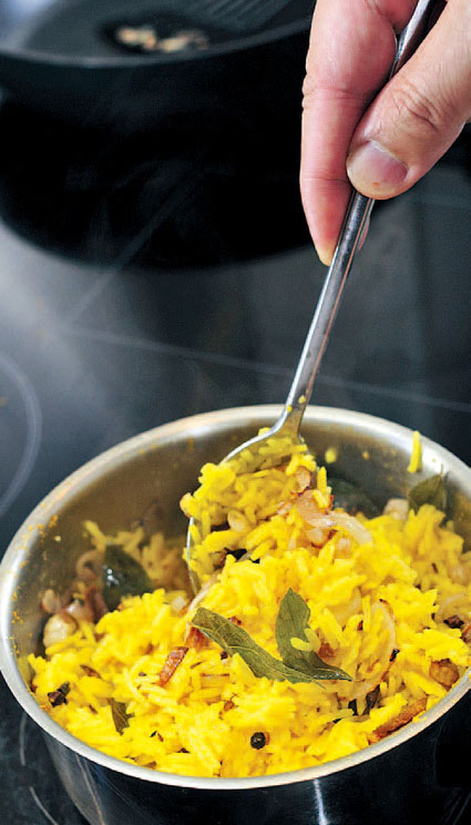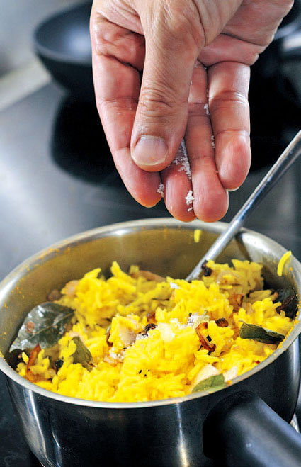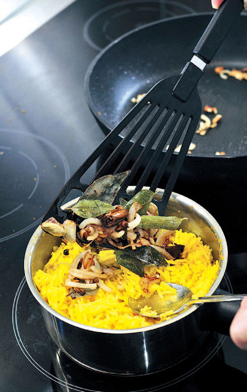 5.将炒好的红葱头及香料放进已煮好的米饭上。(半分钟)