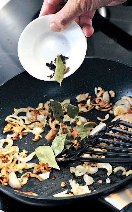 4.继续将干咖喱叶、肉桂皮、丁香、黑胡椒等香料放入,与红葱头共炒至香气渗出。(三分钟)