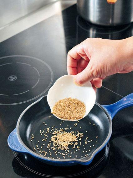3.烧热平底小锅把芝麻烘香,取出备用。(两分钟)