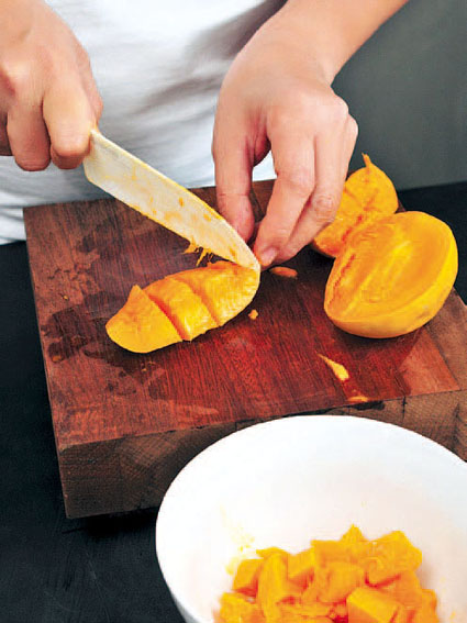 剥了皮的杧果黏黏滑滑地拈在手里随时跑掉,咬下来汁液四溅,吃得一嘴一脸,而吃到果核处更是又咬又啜,几近淫贱。看来吃杧果吃到脸红耳热的也大有人在。直至后来才见人用果刀把两大片连皮杧果剖开十字方格,翻开吃来比较方便优雅,但果核部分还是一样恶搞。