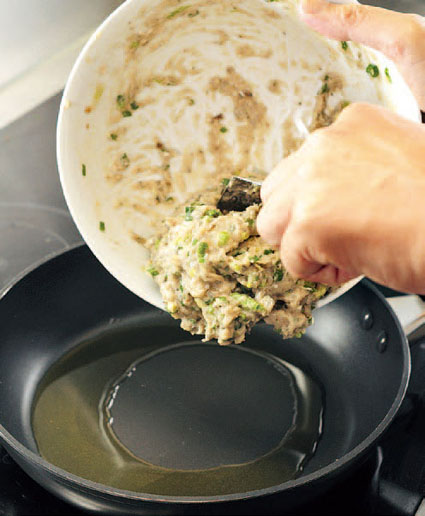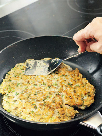 8.快速以锅铲把鲮鱼肉压成饼状,中火把两面煎至金黄。(四分钟)