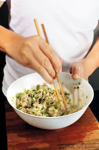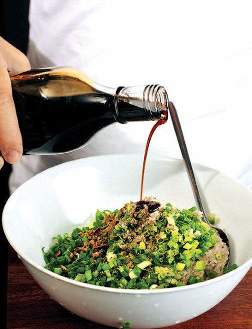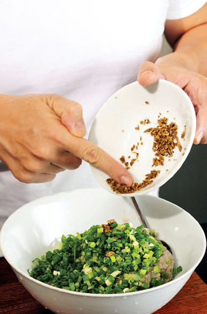 为生鲮鱼肉加入切好的葱末,时机要掌握得当,因为其辛辣清香气味有挥发性,如果过早加入,会因为馅内其他物料中的盐分的影响而减少其辛辣清香,更容易变坏,故必须最后加入。
