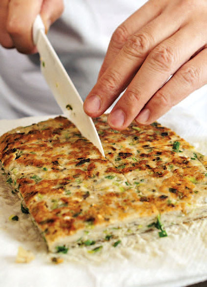 11.鲮鱼饼以厨纸拭去多余油分,切成长条状。(两分钟)