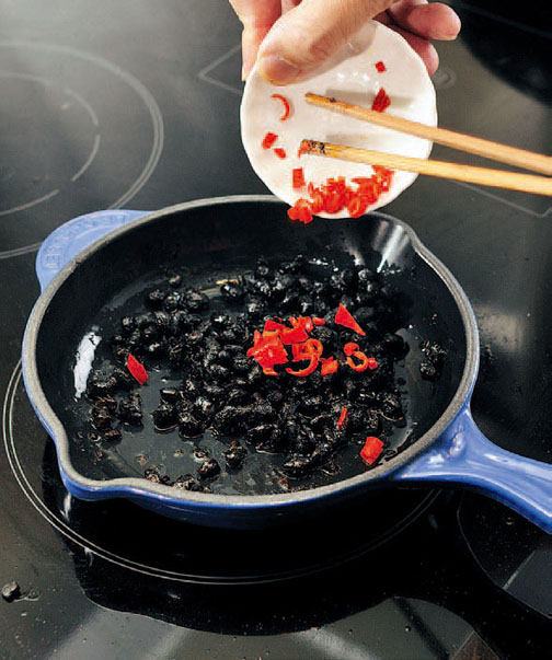 9.另起小锅,以少许油把豆豉及辣椒爆香,然后取出。(两分钟)
