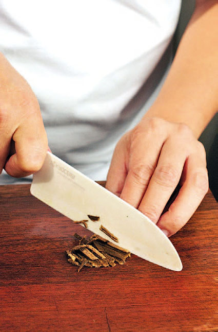 2.以热水浸软的陈皮切丝,备用。(一分半钟)