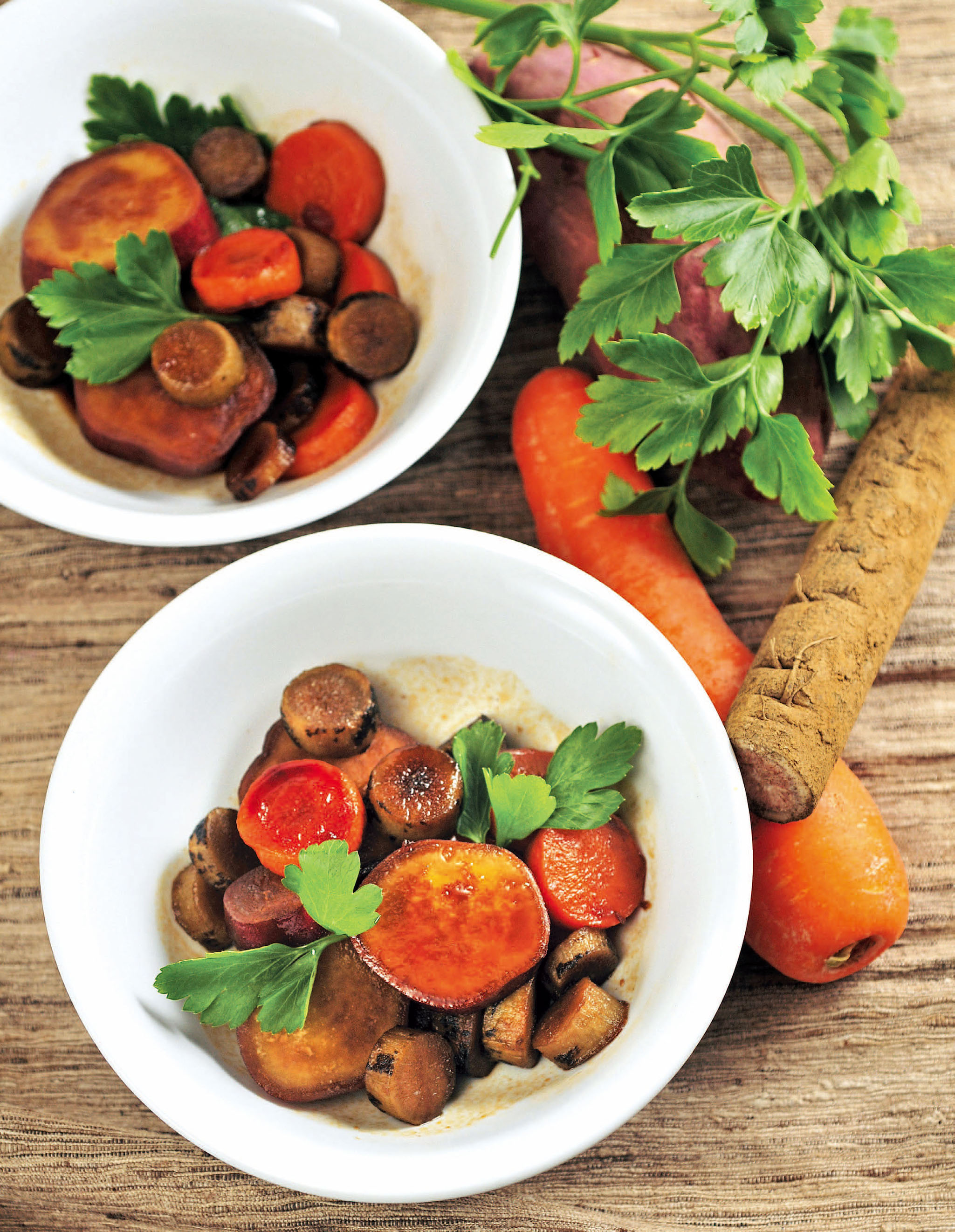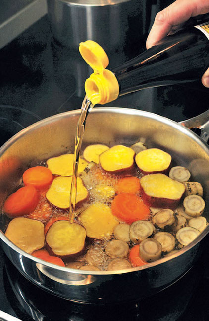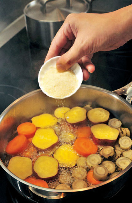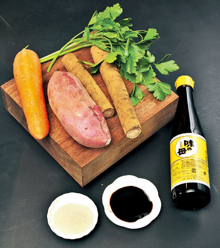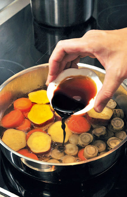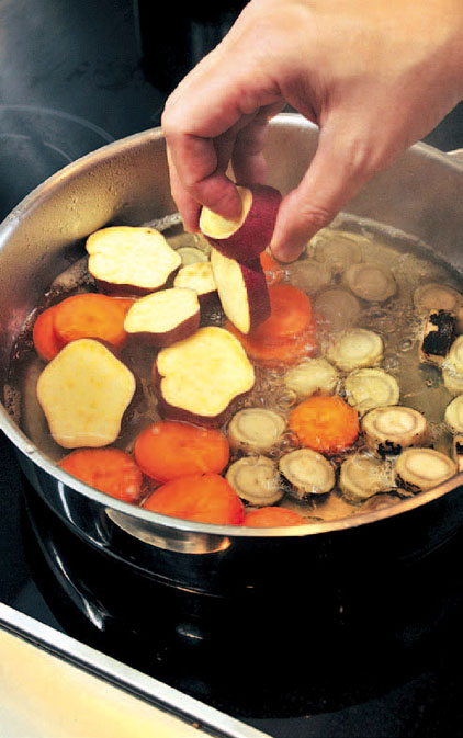 说得夸张一点,每日入厨即使烧一锅水煎两只蛋,也是修行的一种。通过这样日复一日的累积,不难成为烧开水达人和煎蛋达人。进一步把一千几百种食物和烹调步骤东凑西拼再整理出自己的一种手势方法,厨房达人也就顺利诞生!万变不离其宗,一切有根有据,面前这一道简单不过的由几种根茎类植物如番薯、胡萝卜和牛蒡煮成的下饭小菜,正好为从来不入厨房的一众做一个无负担无难度的启动!