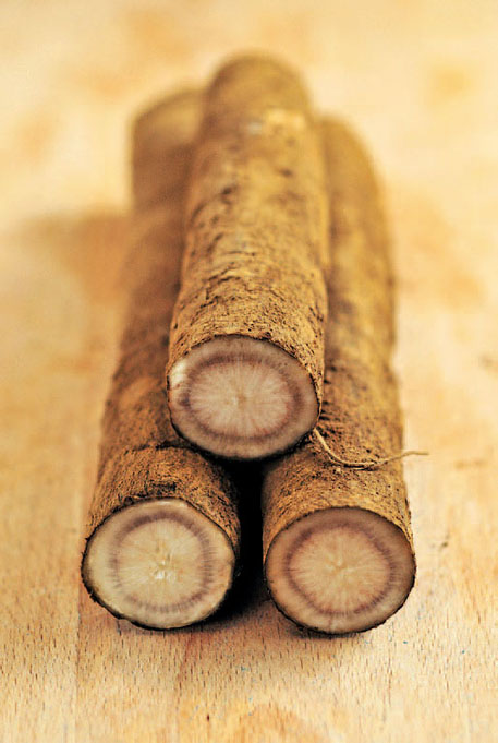 许多许多年前初次在日本料理店吃sukiyaki牛肉锅,除了那一大盘雪花白的牛肉,那一堆高丽菜、春菊、豆腐、粉丝(或苟蒻丝)和两只鸡蛋,还有一大堆泥土色的切成丝状的物体,未知贵姓大名,先把它放在锅里翻滚,热了一下也不觉其变软变滑,迫不及待径自放进嘴里,一嚼就嚼出浓烈的草根味,微苦带甘很有嚼劲——自认吃得苦中苦(如生吃苦瓜)的我欣然接受这草根阶层,细问之下才得知这叫牛蒡,日本人的至爱。之后一直吃吃喝喝,晓得日本料理的前菜小碟中有用牛蒡炒牛肉丝,下了甜甜的酱油还撒上好些烘过的芝麻,爽脆香口,主菜也有用上土鳅和牛蒡的柳川锅,滑嫩与粗糙同在,吃得很是过瘾。