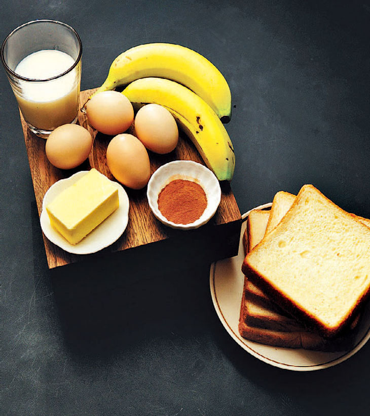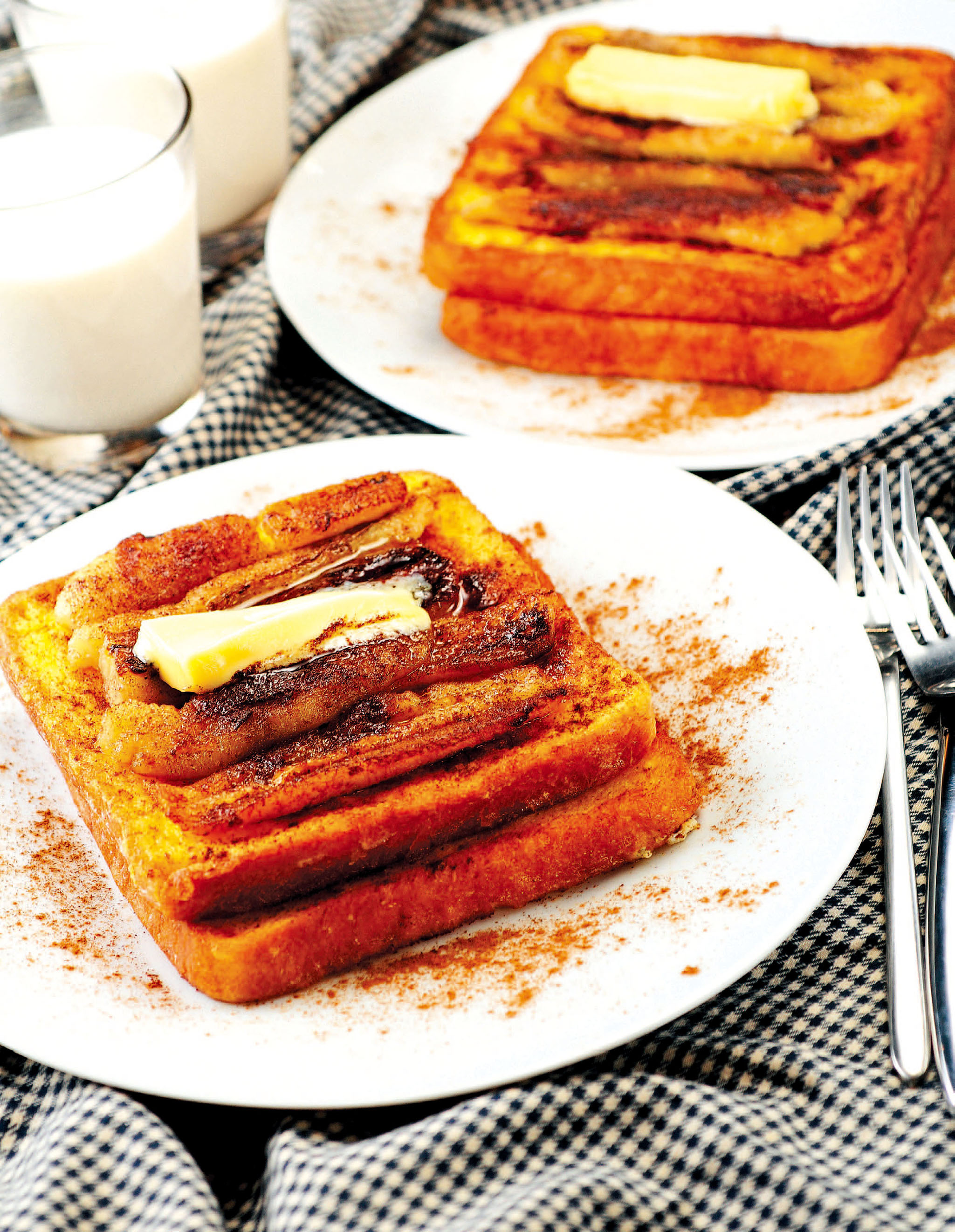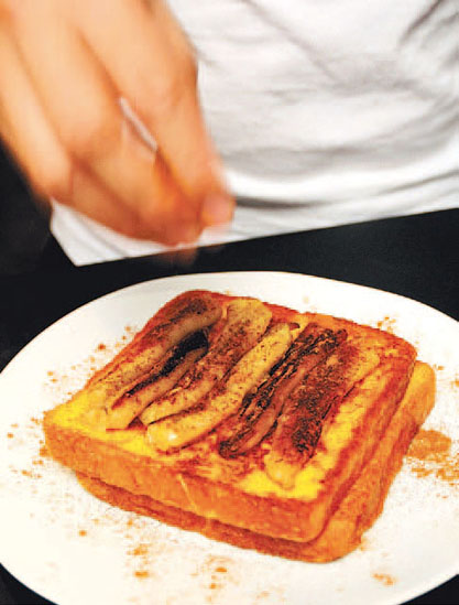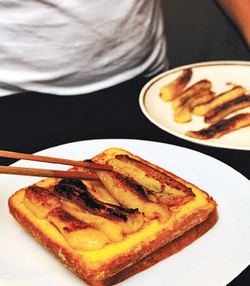 9.将煎好的香蕉铺放于面包表面。(一分钟)