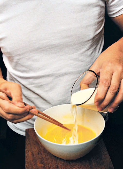 5.打匀鸡蛋并拌入牛奶。(一分钟)