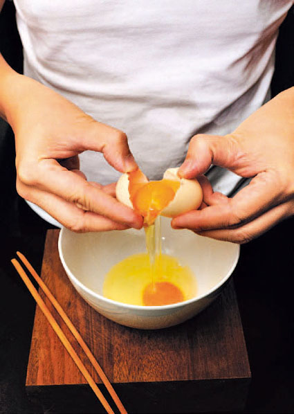 4.将四只鸡蛋敲破置碗中。(一分半钟)