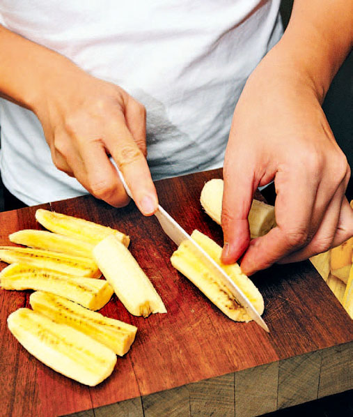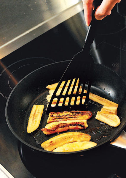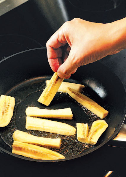 3.小心翻弄以中火将香蕉表面煎至焦香,取出备用。(三分钟)