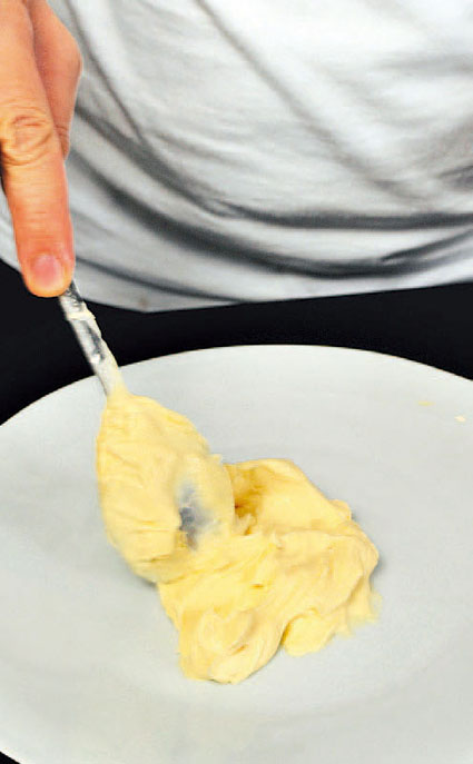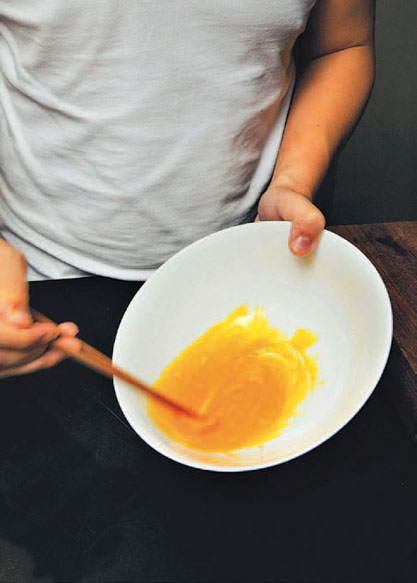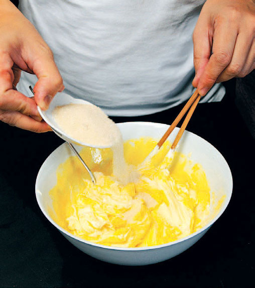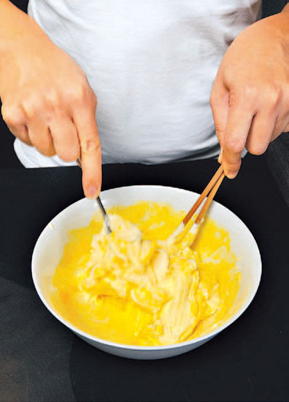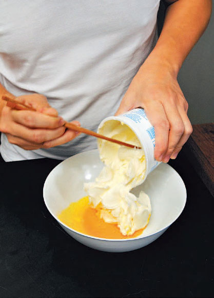 4.将乳酪与蛋黄拌匀。(两分钟)