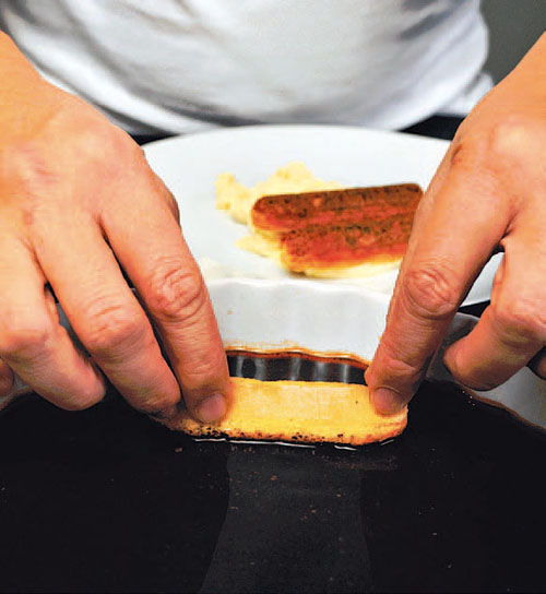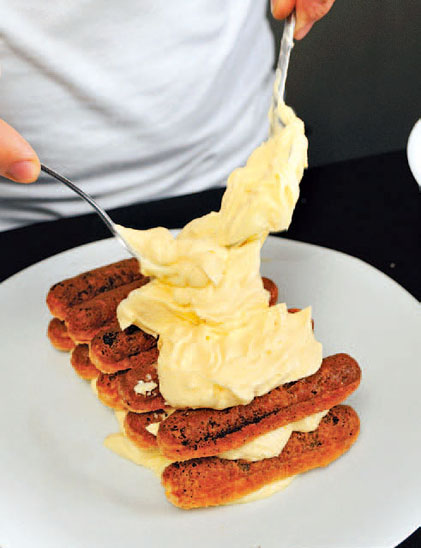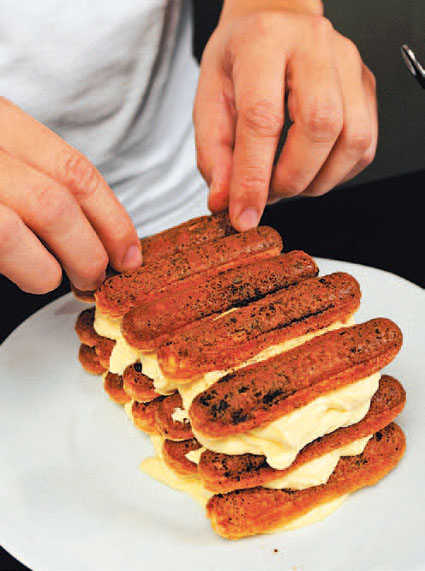 9.以手指甜饼(无糖的背面)吸取碟中咖啡,然后反转甜糖排放于乳酪上。(两分钟)