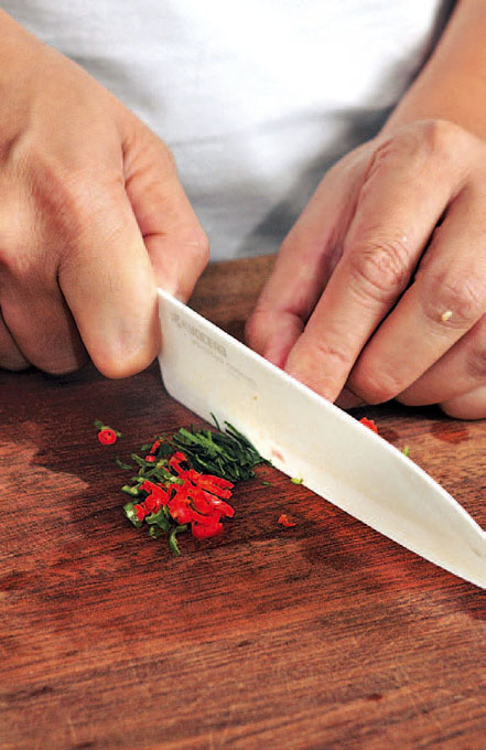 3.指天椒去籽,柠檬叶去叶茎,切极碎。(一分钟)