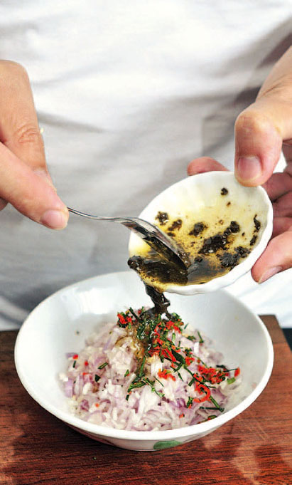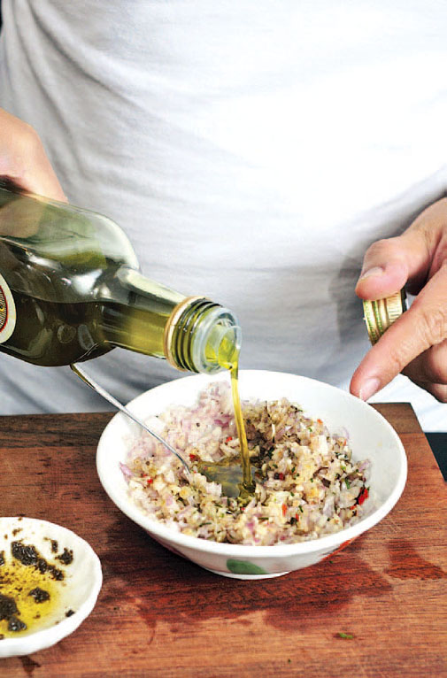 4.以少许橄榄油调开捣碎的少许虾膏,拌进所有切碎的材料中。(两分钟)