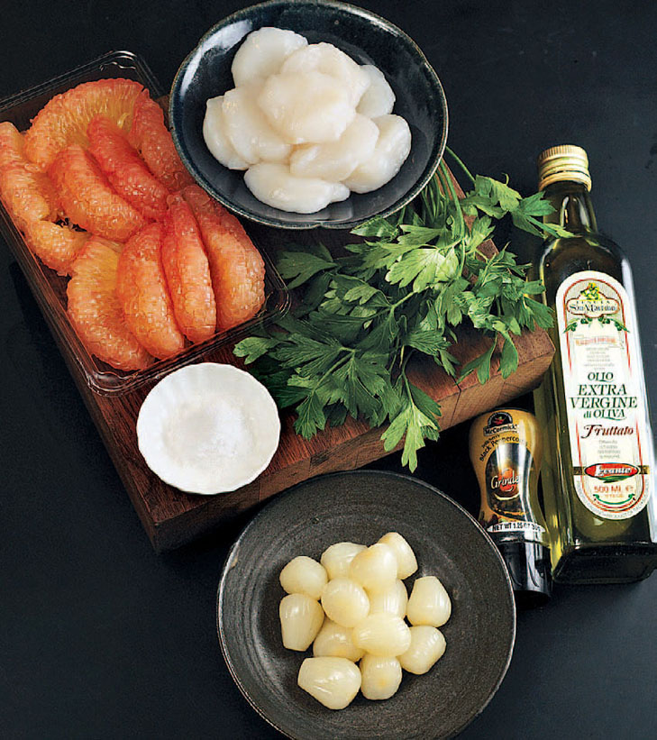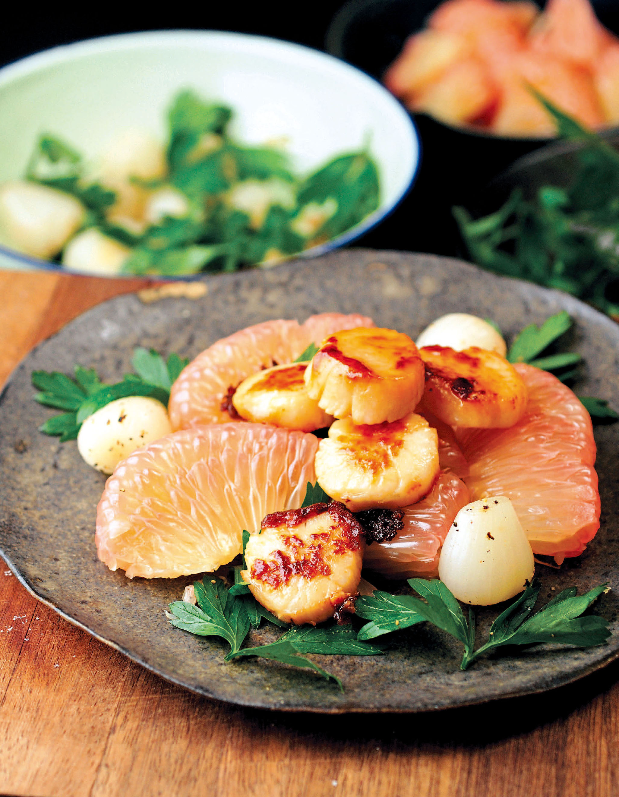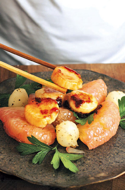 8.上碟时先把芫荽叶片放好,再放入柚子肉及酸荞头,最后把煎得表面盐粒微焦的带子放上,中秋当令应节凉拌是也。(一分钟)