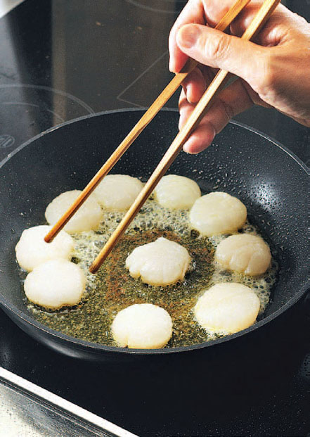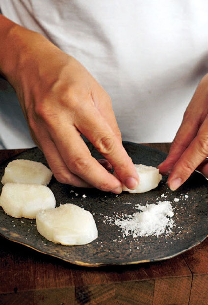 6.鲜带子抹干水分,以海盐蘸擦两面。(一分钟)