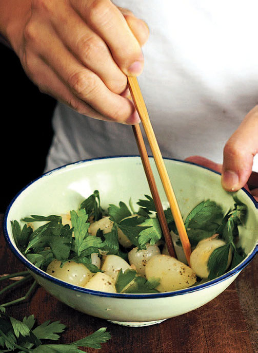 2.将酸荞头原颗与芫荽叶同置碗中。(一分钟)