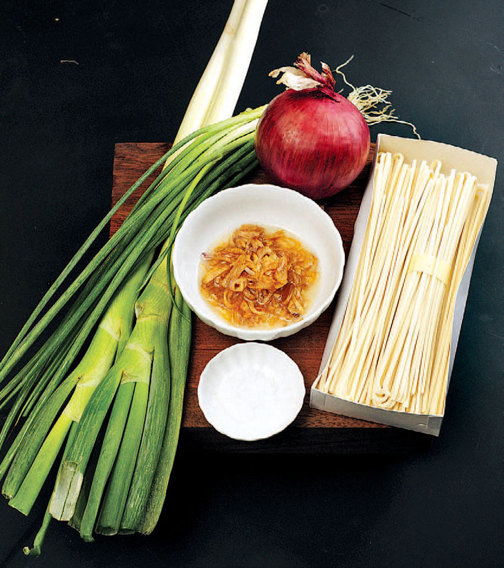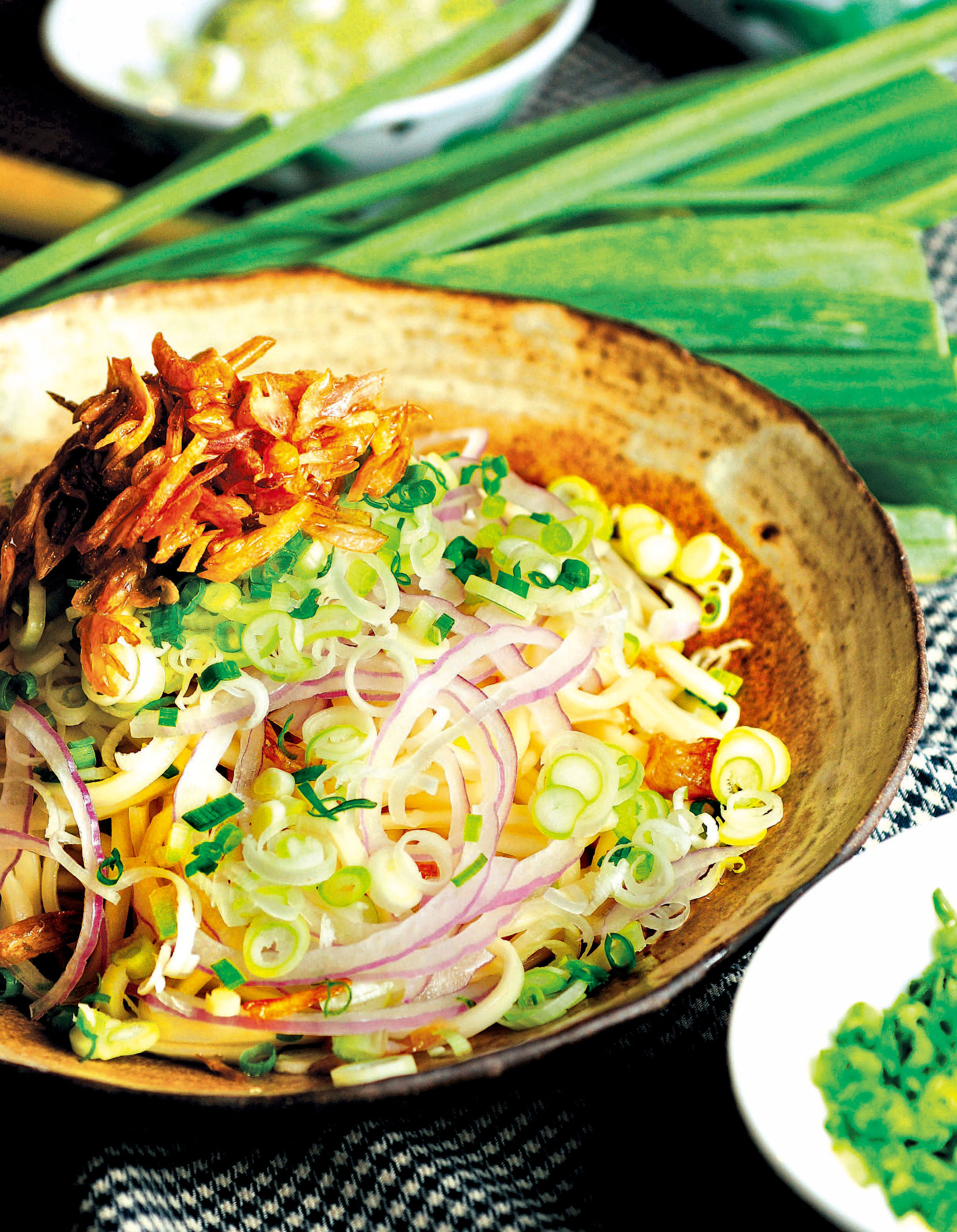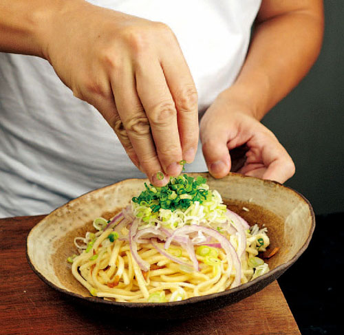 9.撒上红洋葱丝、大葱白及青葱,将碗中余下的炸香葱酥再放其上,酥香辛鲜的一道拌面,轻松上场。(两分钟)