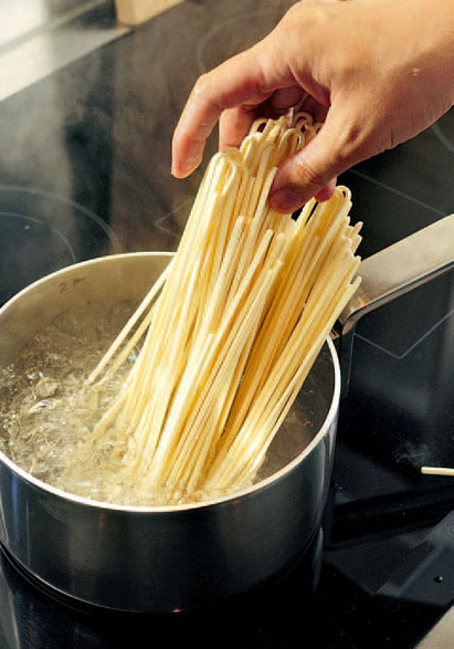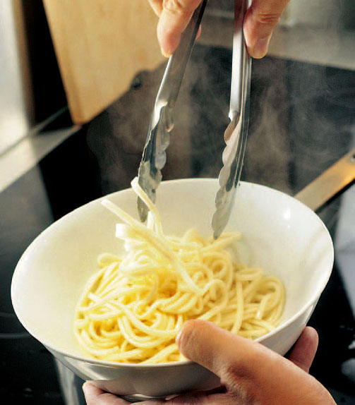 5.面条煮好,夹起放大碗中,准备捞拌。(半分钟)