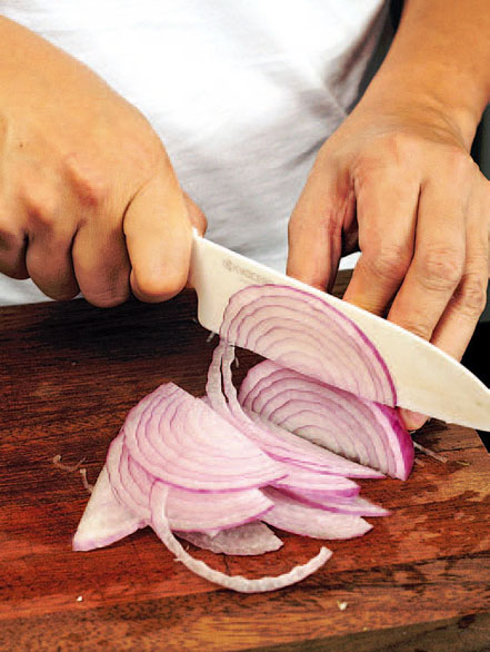 3.红洋葱去外皮,切极细丝,备用。(两分钟)