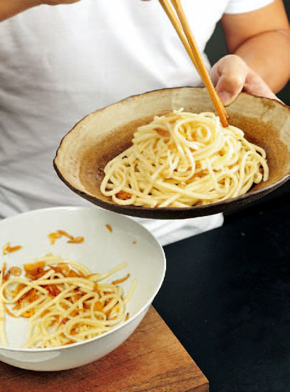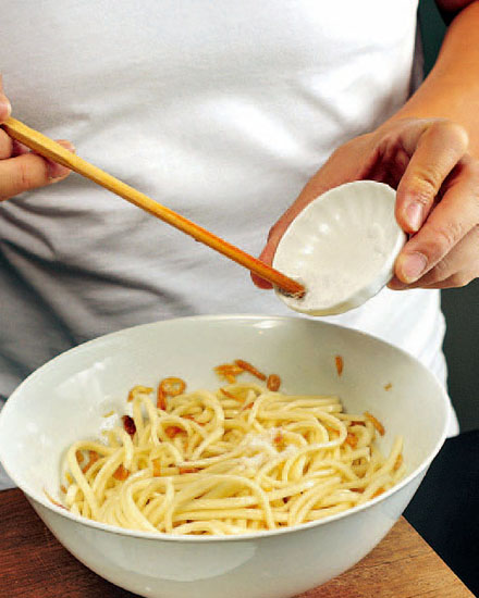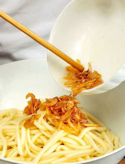 8.把香葱酥、海盐与面条拌好后转盛碟中。(两分钟)