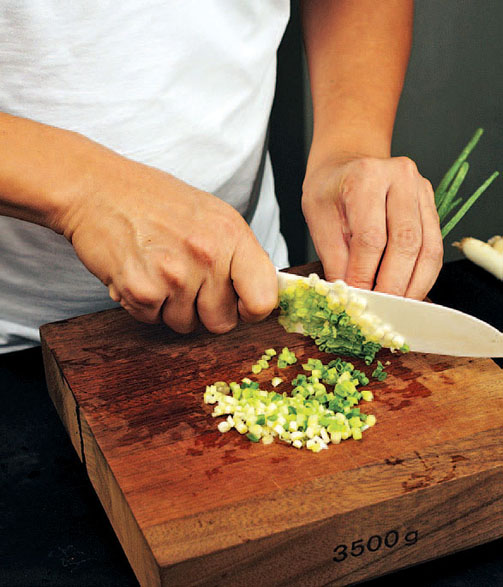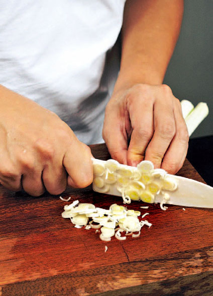 1.青葱洗净,取最幼嫩葱白较多部分,切极碎,备用。(一分钟)